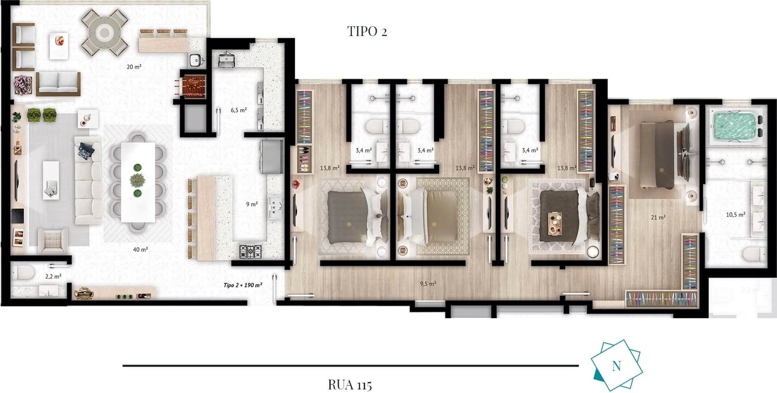 • Apartamentos Espaçosos: Ambientes amplos e bem planejados para o seu conforto e bem-estar.
