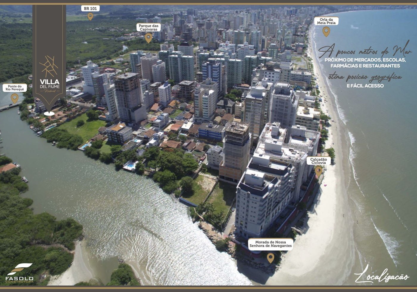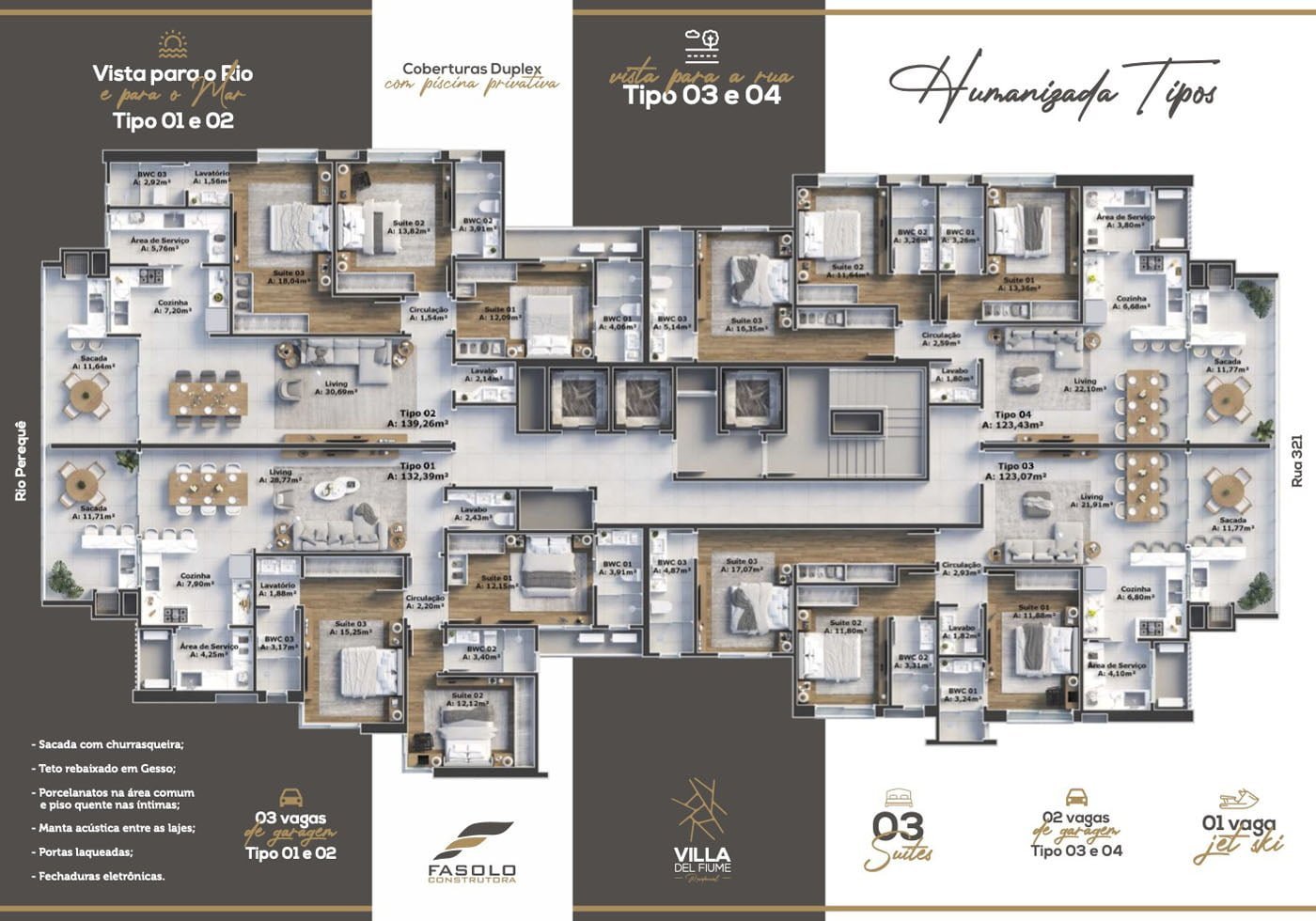 Villa del Fiume Residencial, apartamentos com 3 suítes, duplex 4 suítes e penthouse com 5 suítes. Empreendimento conta com Área de Lazer exclusiva, incluindo uma marina privativa para Jet Skis.